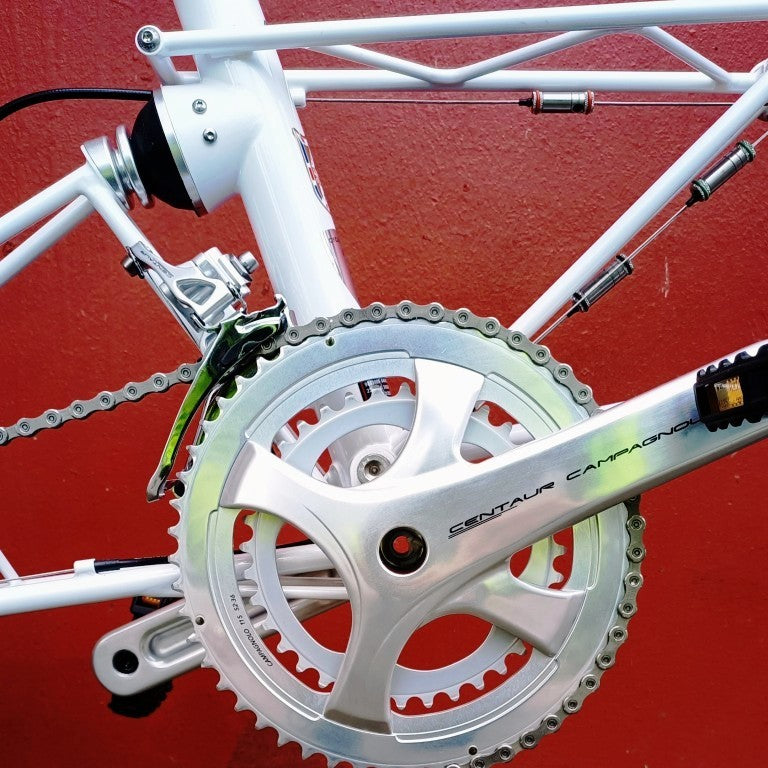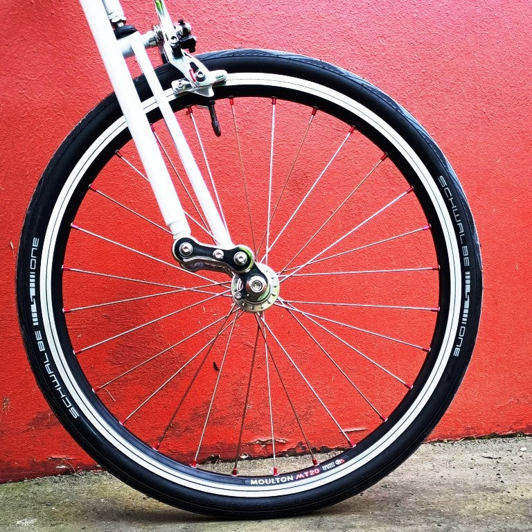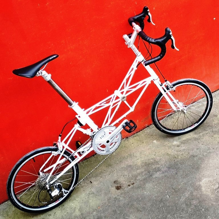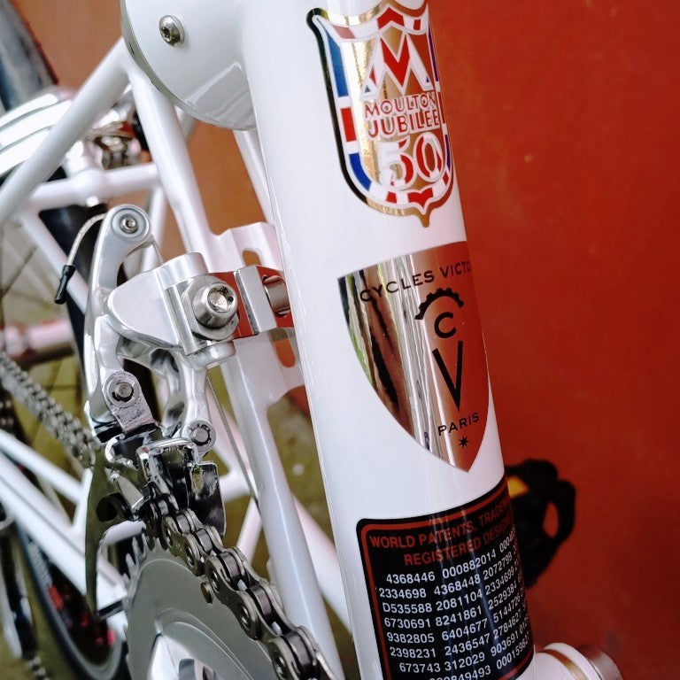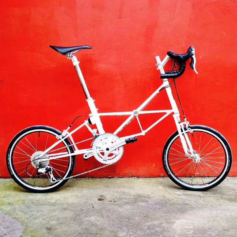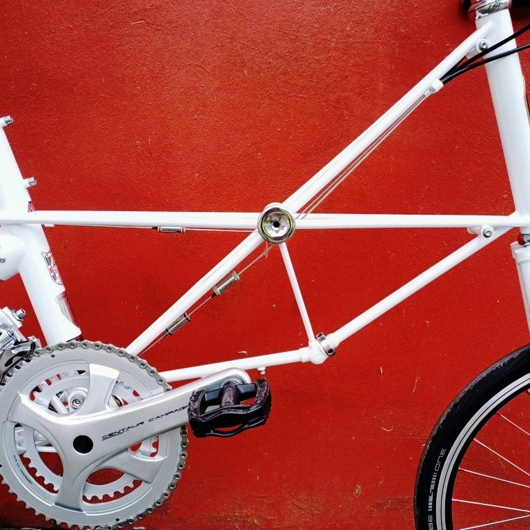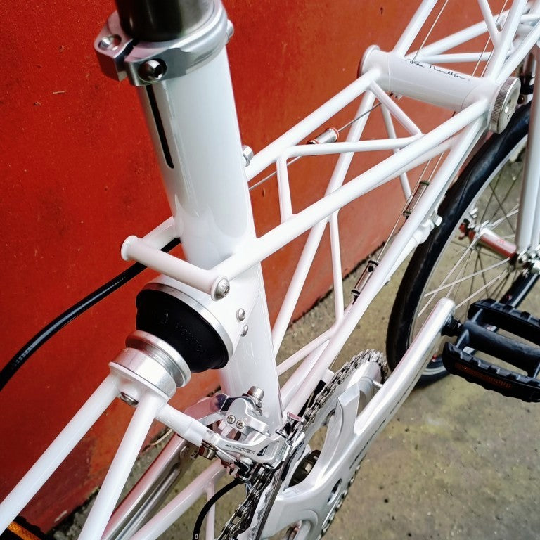 Alex Moulton Jubilée en blanc. Mini vélo tout suspendu démontable (et ne pas pliable). Monté en Campagnolo Centaur 11 vitesses, double plateau 52/36, pneus Schwalbe One 20*1.1