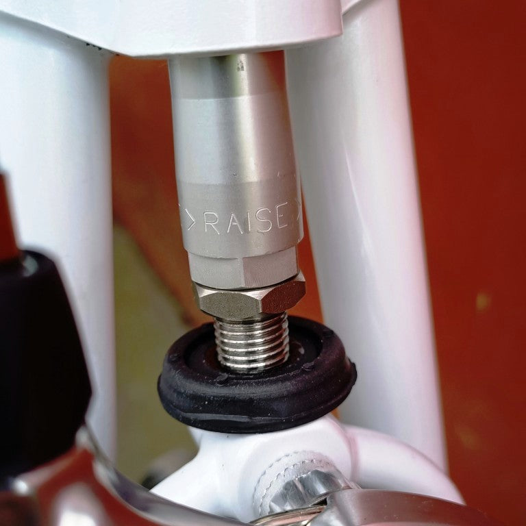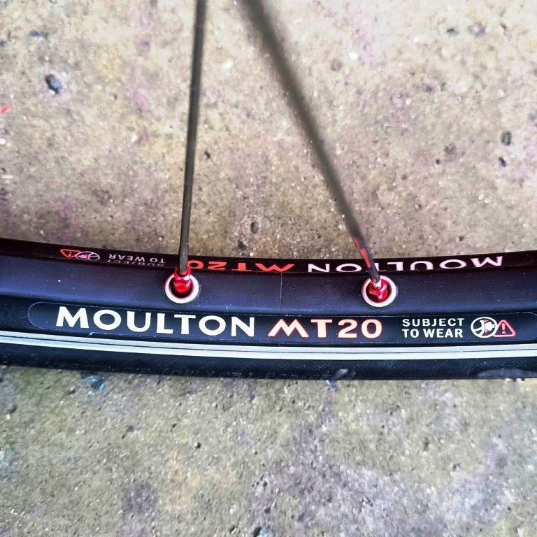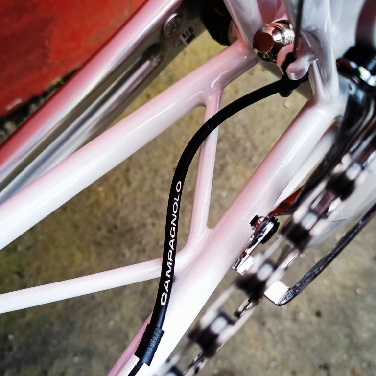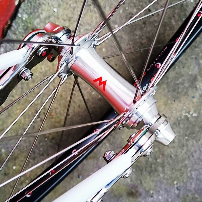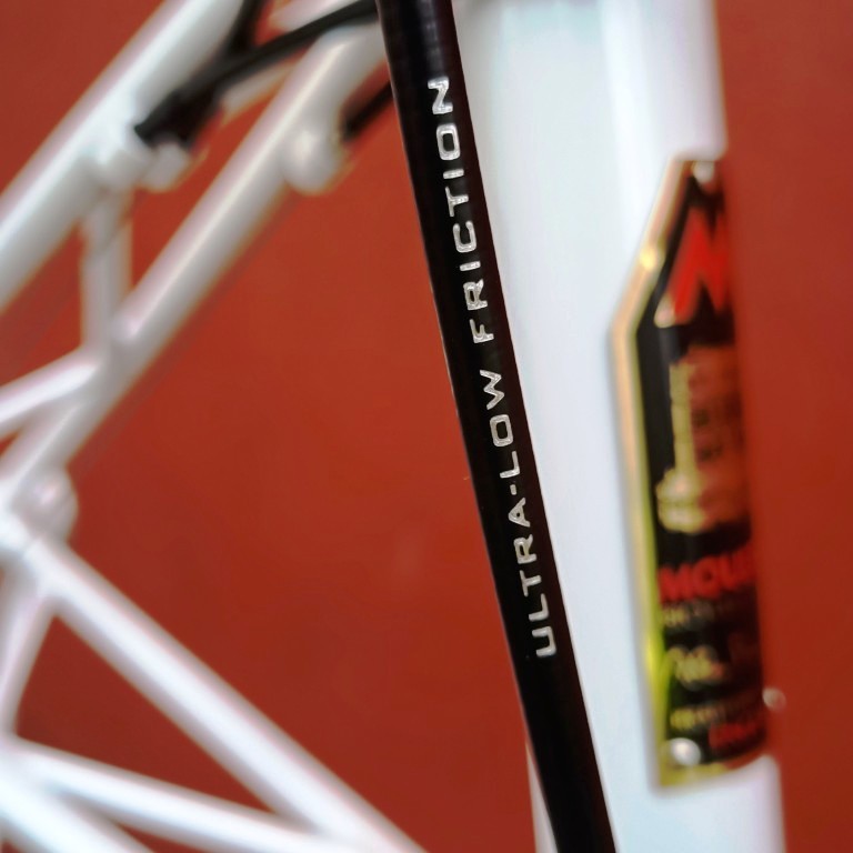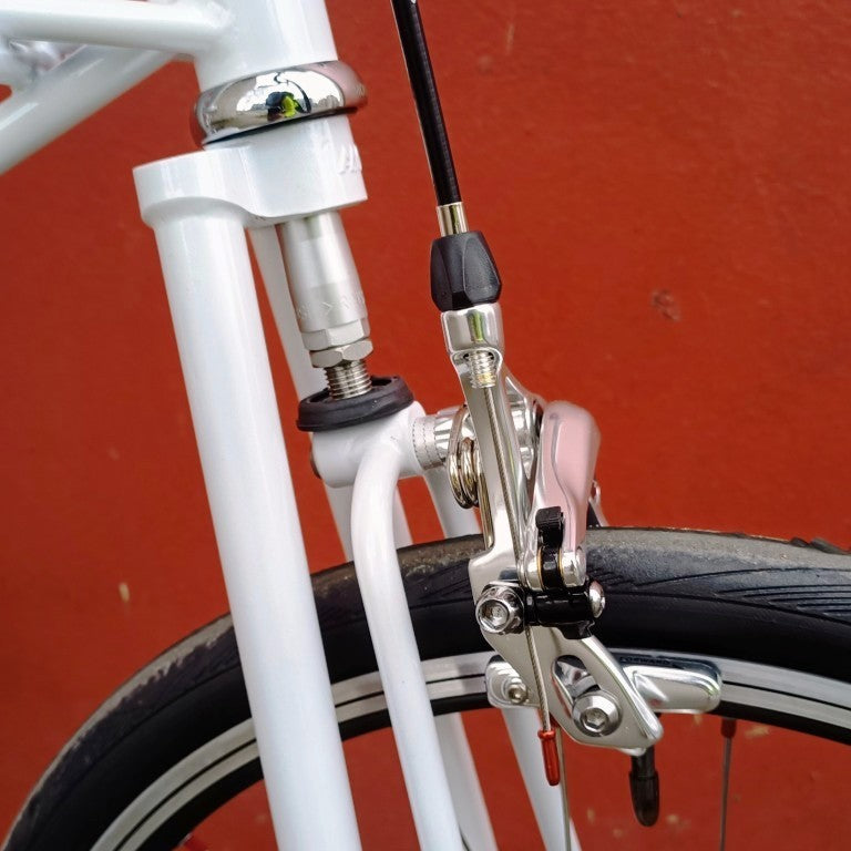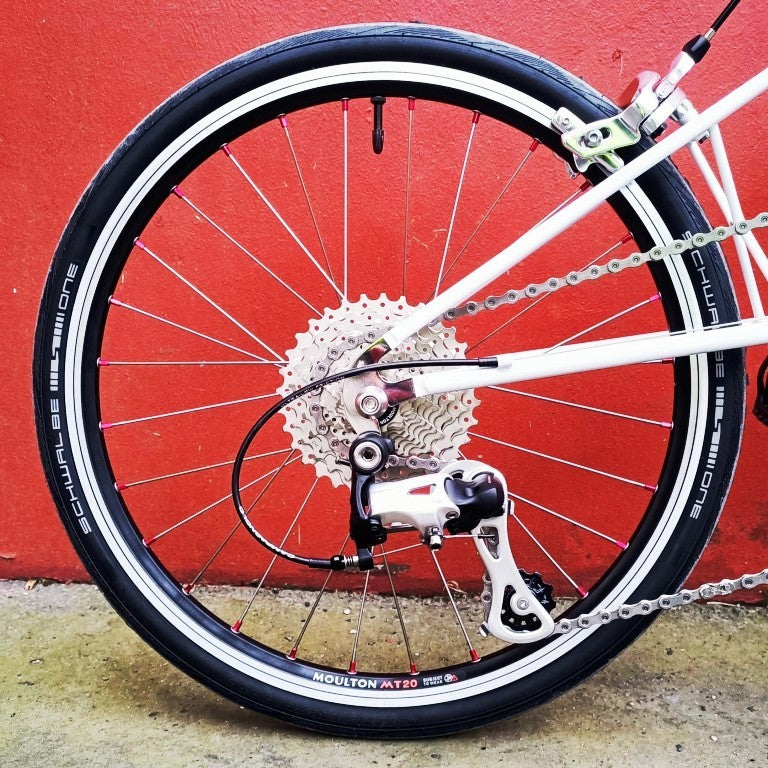 Alex Moulton Jubilée en blanc. Mini vélo tout suspendu démontable (et ne pas pliable). Monté en Campagnolo Centaur 11 vitesses, double plateau 52/36, pneus Schwalbe One 20*1.1
