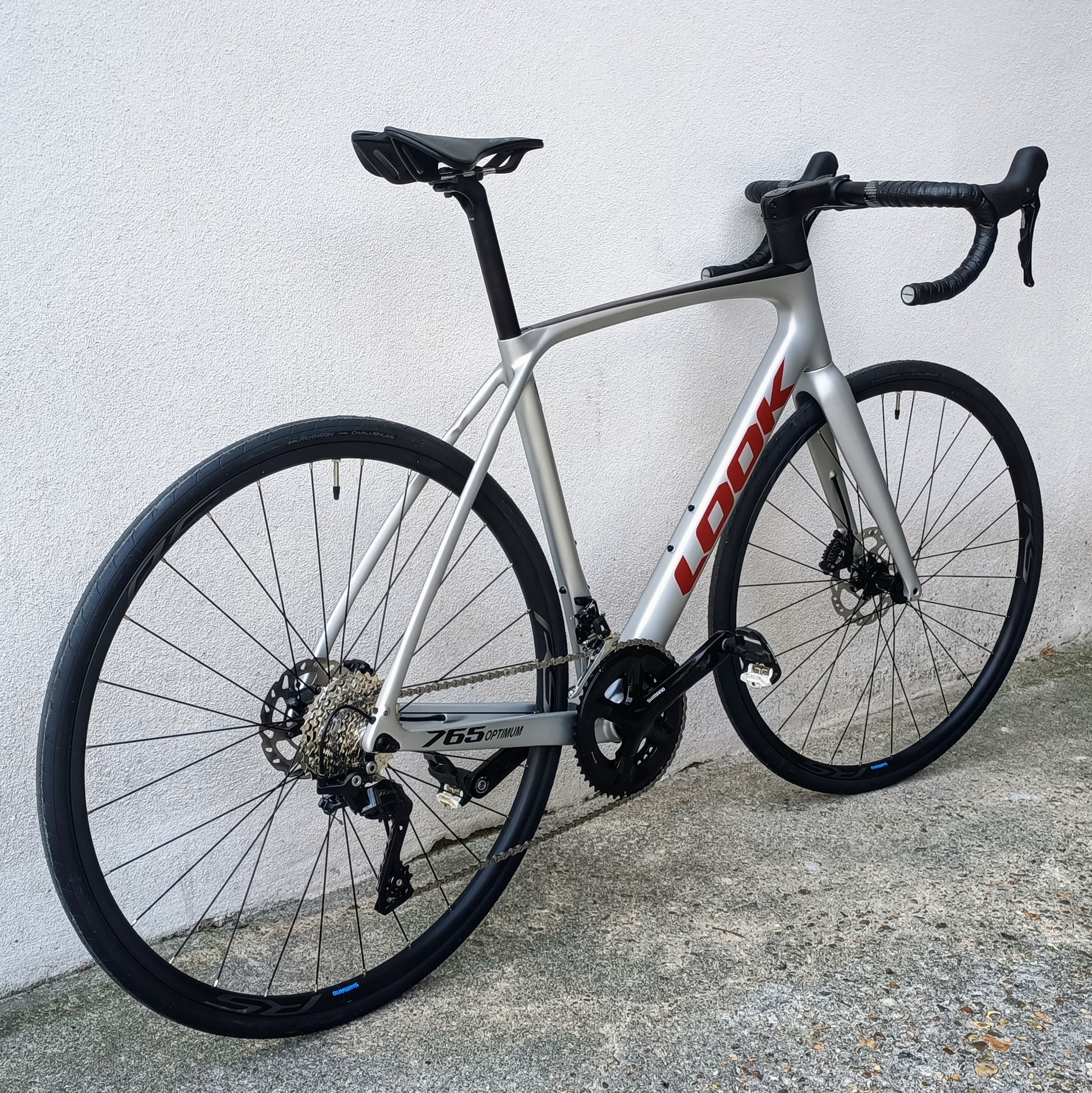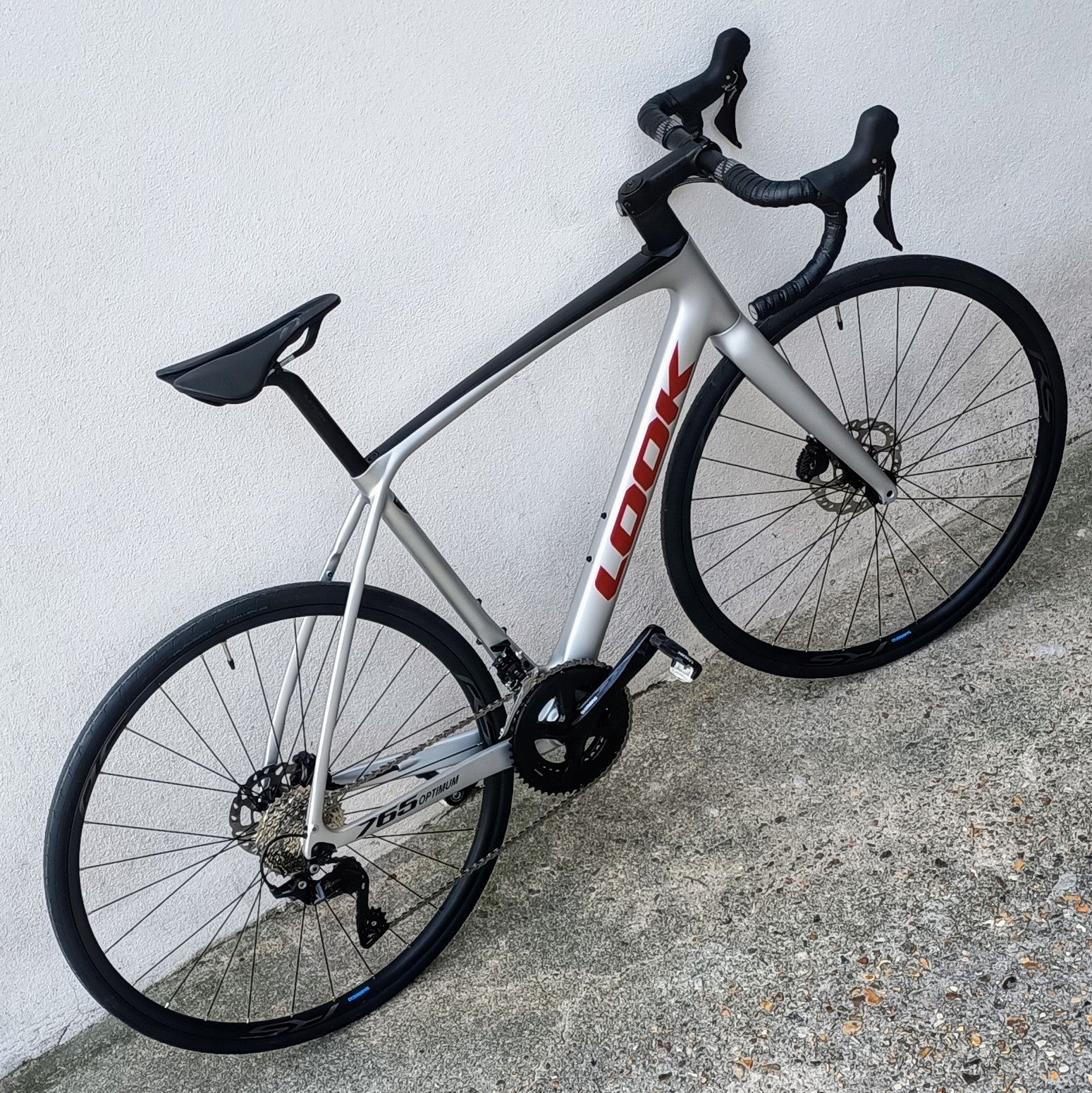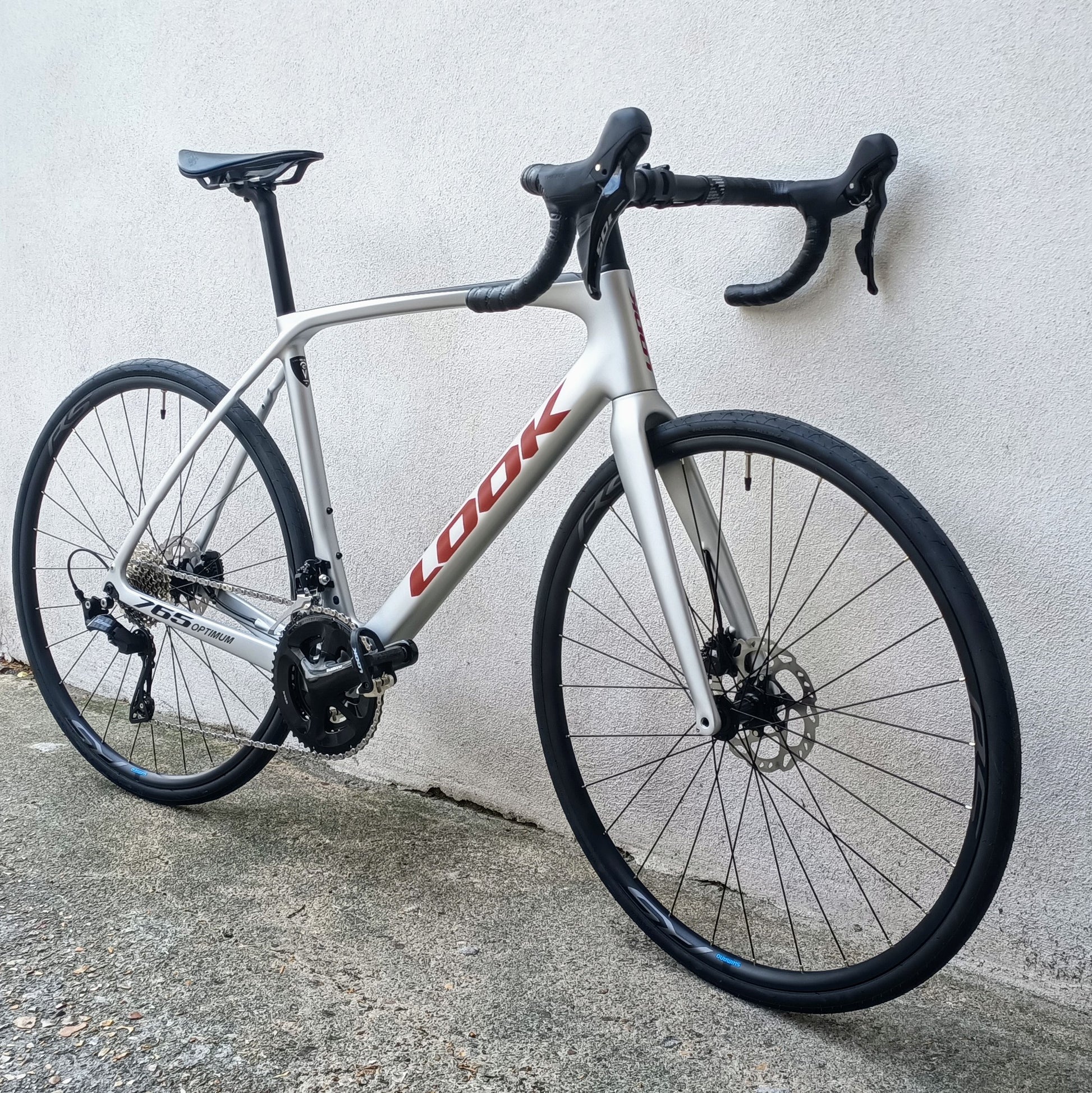 Look 765 Optimum - vélo de route typé endurance / gran fondo, couleur gris clair avec dessus du tube horizontal en noir, Look marqué en rouge sanguine.