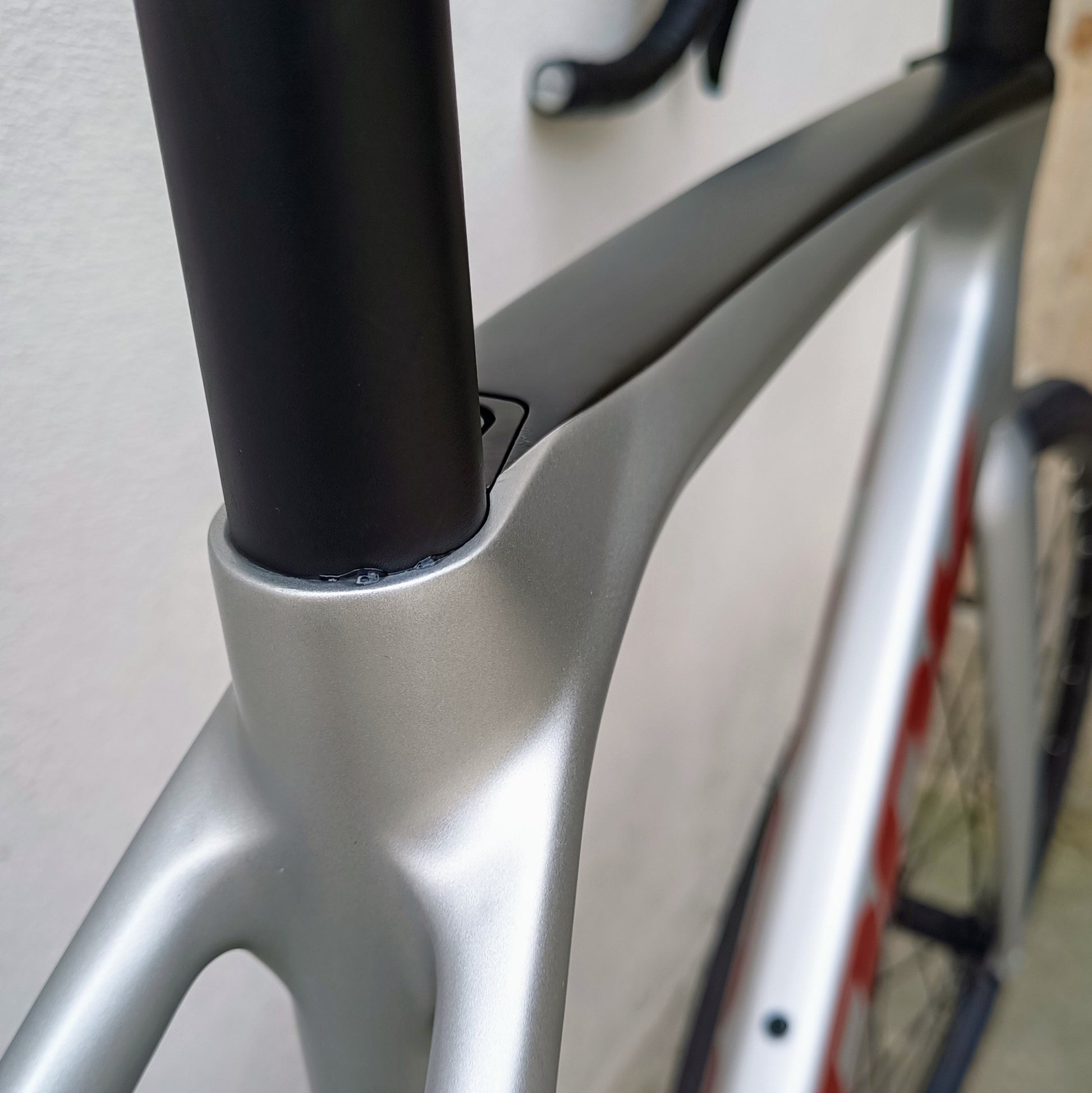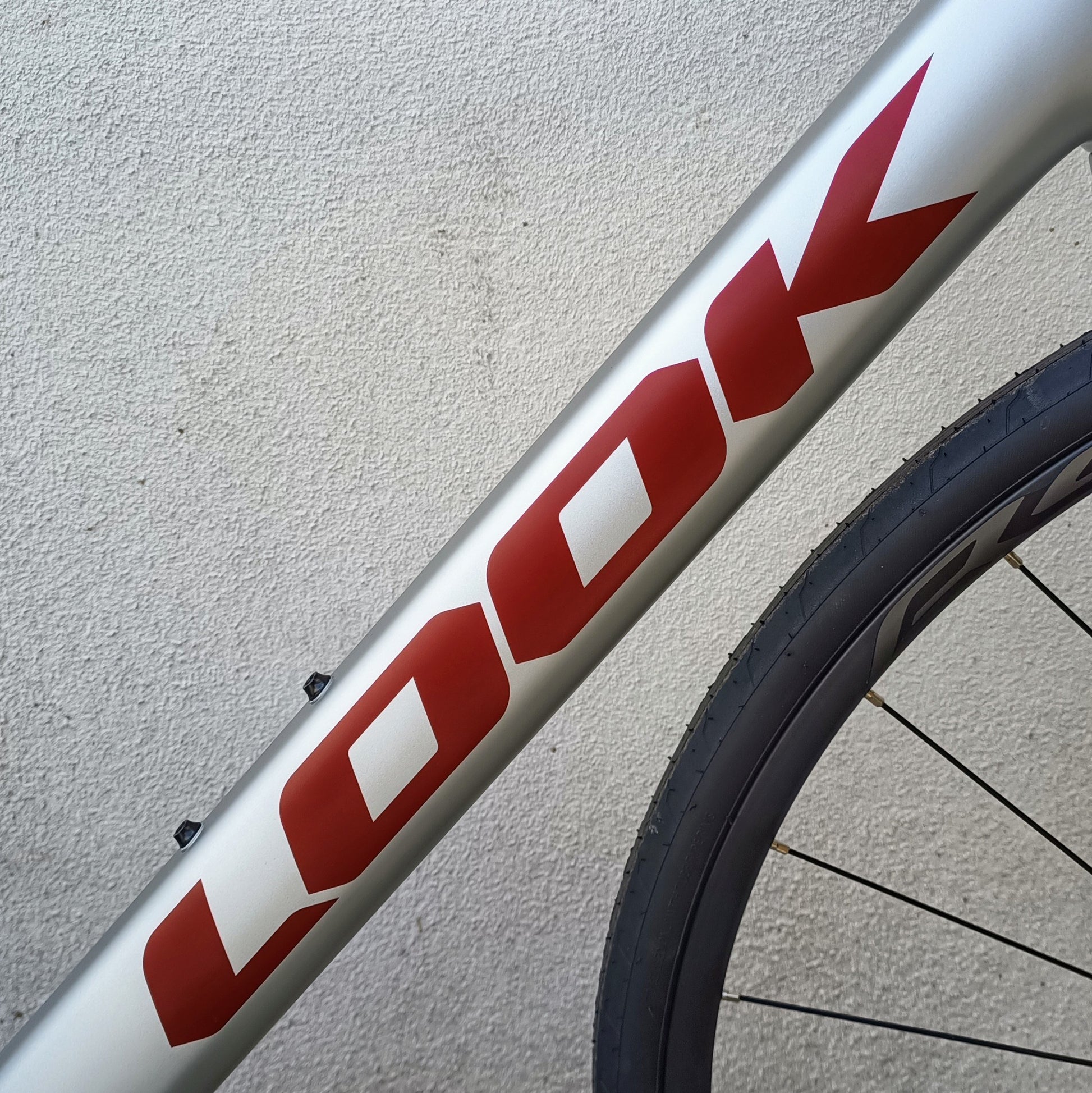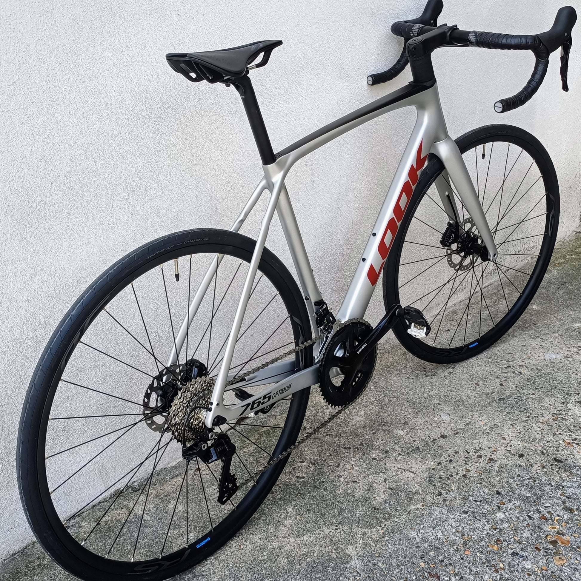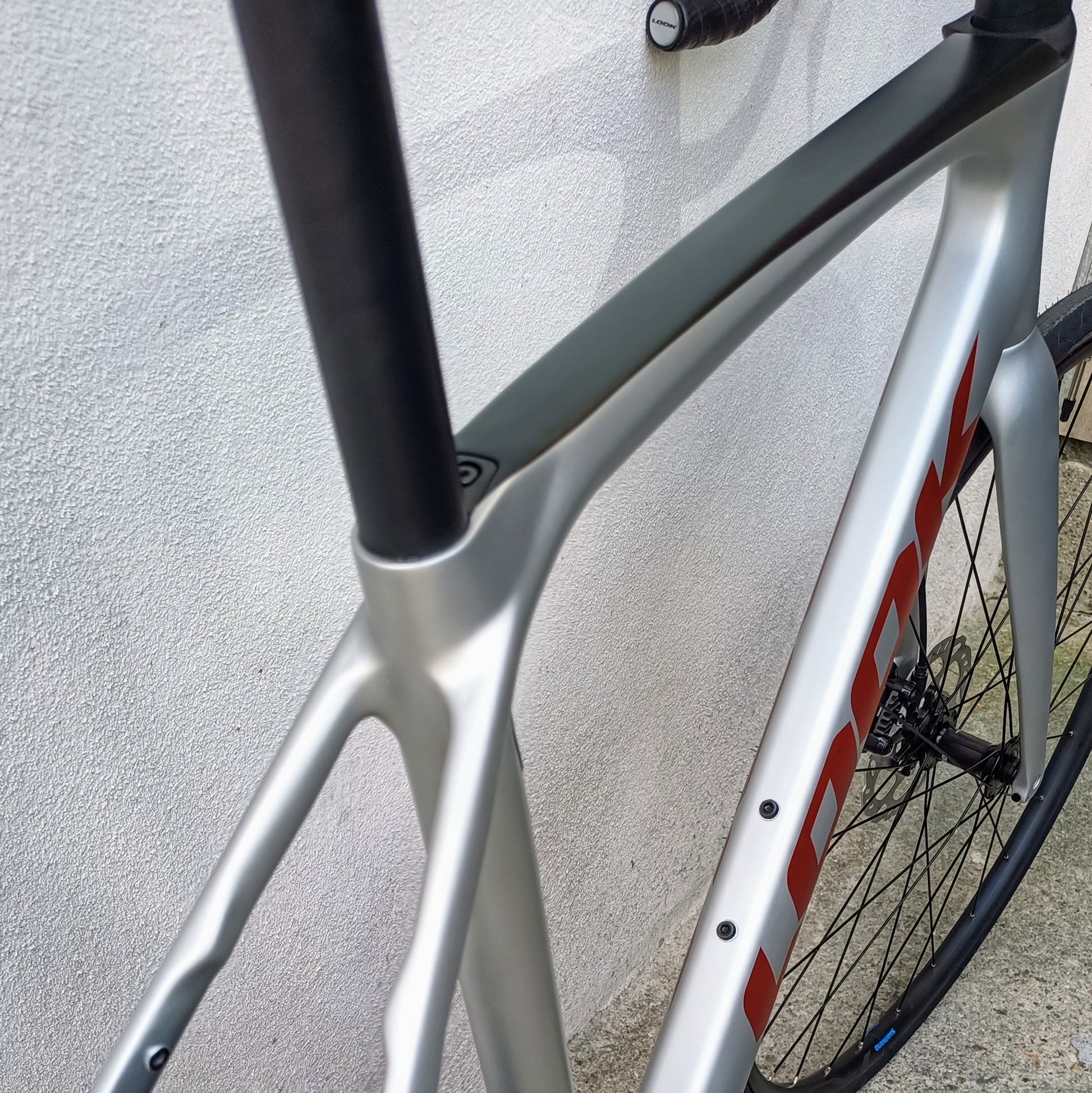 Look 765 Optimum - vélo de route typé endurance / gran fondo, couleur gris clair avec dessus du tube horizontal en noir, Look marqué en rouge sanguine.